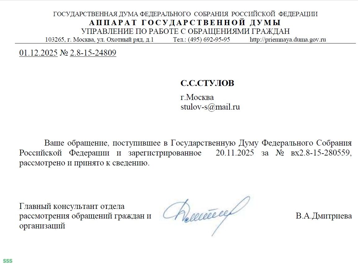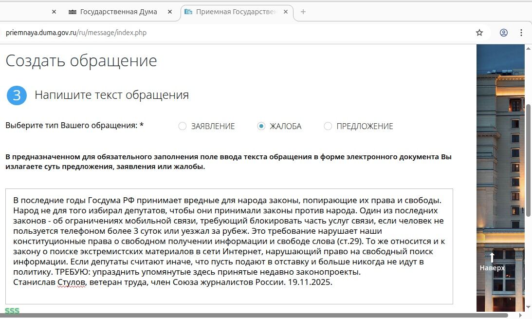 19.11.2005 Станислав Стулов направил в Государственную Думу РФ жалобу по поводу информационной политики властей России, на которую пришел ответ от 01.12.2025, что обращение принято к сведению. К этому добавим, что Дмитровское окружное местное отделение Союза журналистов России 19.12.2025 осудило информационную политику властей России (публикуется на сайте отделения Дмитровское отделение СЖР).